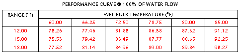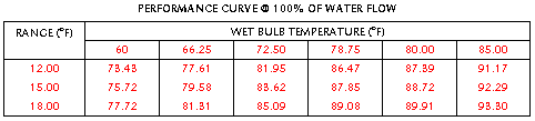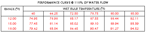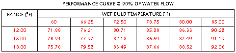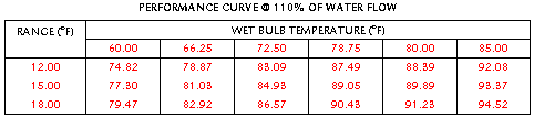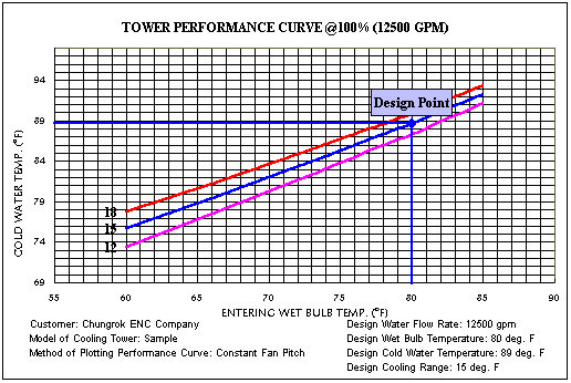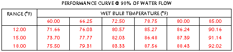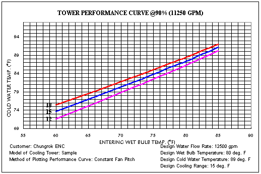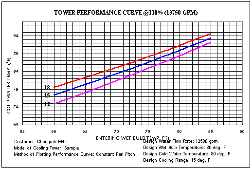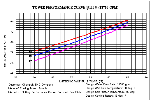 The curves are plotted for 80, 100 & 120% of cooling range on 90, 100 & 110% of design water flow rate. Note that these performance curves are based on the constant fan pitch and are plotted by the detail method. For further details of calculation, download the file.