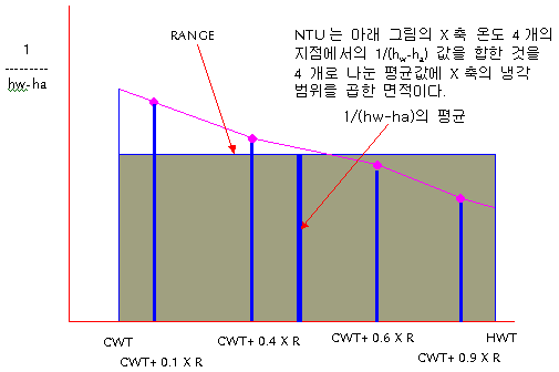 구하고 적분 구간에 해당되는 냉각 범위를 곱한 것이 NTU에 해당 된다. 전자 계산기가>